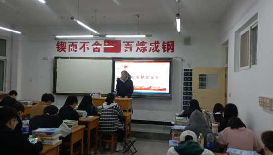 班会上,各班辅导员老师首先通过视频、图片等方式,给同学们讲述了国家保密法的相关内容、增强保密意识的重要性。接着,通过案例,给同学们详细介绍了日常生活中的保密防范措施,如不私自打听、索取、传播国家秘密或敏感信息;不能用微信、微博、QQ等社交工具发布或转发涉及国家秘密的信息;不能扫描来路不明的二维码,不连接免费或未加密防护的Wi-Fi网络等。