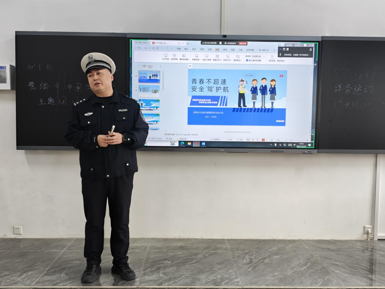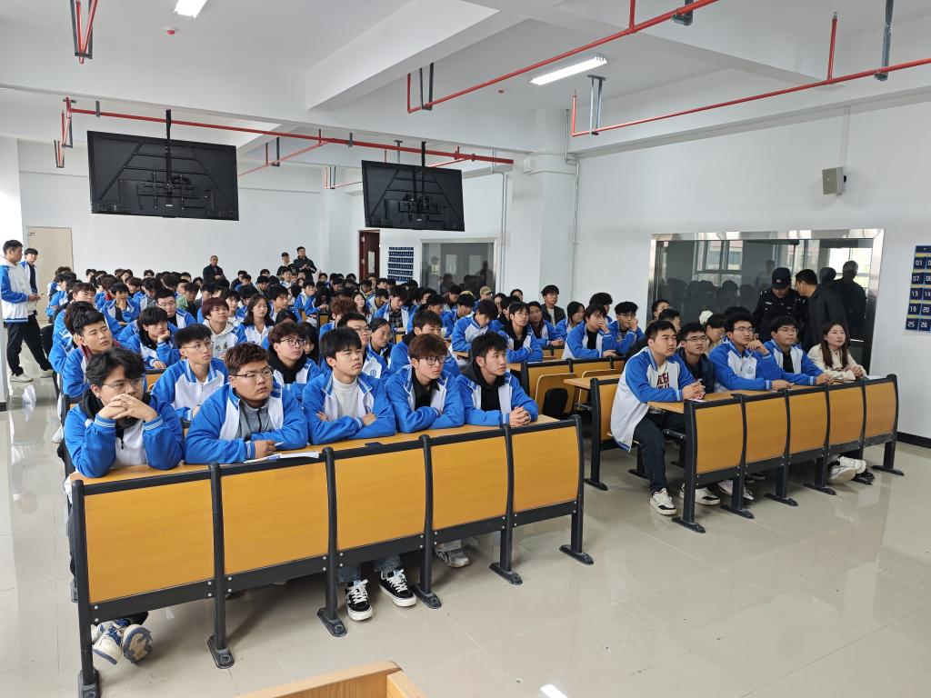 本次讲座特别邀请金台交警大队乔世超警官担任主讲嘉宾。乔警官以《青春不超速,安全驾护航》为题,结合PPT课件、典型案例视频及权威数据,为同学们带来了一场生动且深刻的交通安全知识盛宴。