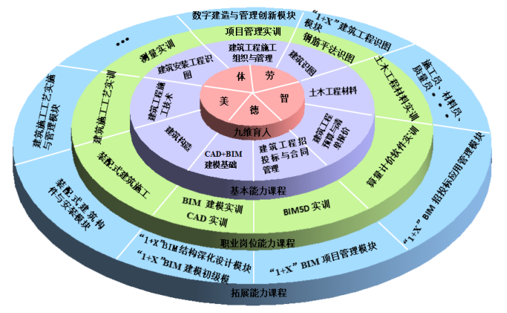 为落实1+X证书制度,增强工程造价专业服务经济和社会发展的能力,调动社会力量参与人才培养,科学构建工程造价课程体系。在分析工程造价专业职业岗位能力、职业等级证书考试大纲的基础上,利用BCG矩阵理论,按照工程造价专业就业岗位占比和1+X(BIM)职业技能等级证书相关度两个维度重构专业课程。通过职业技能等级标准与专业教学标准对接,“X”证书培训内容与专业课程教学内容融通,“X”证书培训过程与专业教学过程一体化设计,“X”职业技能考核与专业课程考试同步化进行,“1”与“X”相互转换。构建了以“九维育人”为核心的同心多元化专业课程体系,细化岗位职业素养和能力要求,深入研究1+X职业技能等级标准,按照“核心-基础-专项-拓展”的思路,解决了将1+X(BIM)证书职业技能等级要求、岗位能力要求和专业课程体系的有效融合问题。
