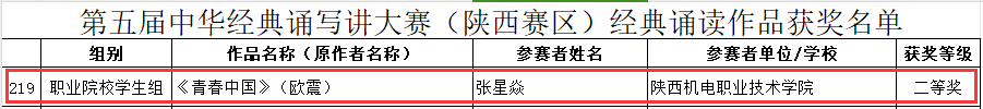 自大赛通知发布以来,公司师生积极筹备,22铁道运管2班张星焱同学的作品《青春中国》以校赛第一名的成绩被推荐参加陕西赛区“诵读中国”经典诵读大赛。