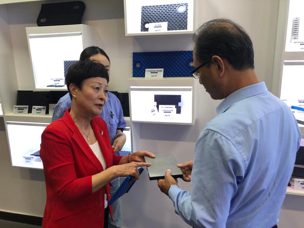 随后,李慧玲董事长陪同伊书记一行参观了长美科技展厅,观看了长美科技公司宣传片,李慧玲董事长介绍了企业技术攻关,攻坚克难的艰辛历程,认真聆听了董事长对产品的详细介绍与产品内涵的科技含量,沉浸式体验了公司减振降噪的显著效果。