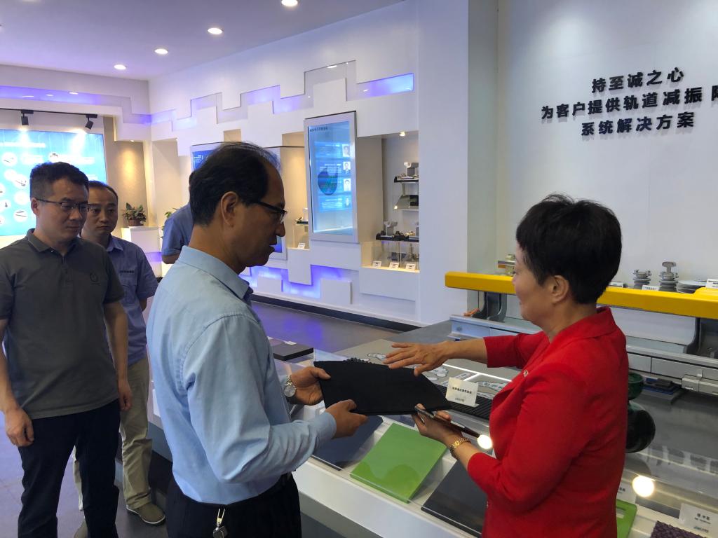 伊逊智一行受到陕西长美科技集团有限公司董事长李慧玲的热情接待。李慧玲董事长详细介绍了企业从诞生到发展,再到壮大的成长历程,讲述了企业发展过程中的业务转型与升级,近期目标与远景规划。她讲到陕西长美科技集团有限责任公司已成为我国铁路及城市轨道交通领域轨道减振降噪及供电绝缘防护产品的专业制造集成商。主要产品包括轨道高分子材料系列产品,新型中高级减振扣件、系列减振弹性体、道砟道床隔振垫、浮置板道床隔振垫、调谐式复合弹簧隔振器、钢轨波磨抑制器、系列宽频钢轨阻尼减振降噪器等产品。