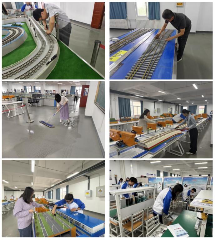 专业维护,筑牢实训根基活动期间,支部党员入党积极分子公司志愿者对校内各实训基地进行全面维护。在铁道工程综合实训基地与铁道沙盘实验室,大家细致清洁轨道模型、信号设备及模拟沙盘,对设备运行状态进行逐一检查,针对线路接触不良、沙盘部件松动等问题及时维修保养,确保实训设备始终处于良好运行状态。同时,党员们对土工实训室和线桥隧模型室的工具材料进行分类整理,规范摆放区域,彻底清理卫生死角,为师生营造了整洁有序的实训环境,为后续实践教学的开展提供了坚实保障。