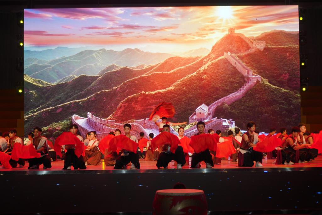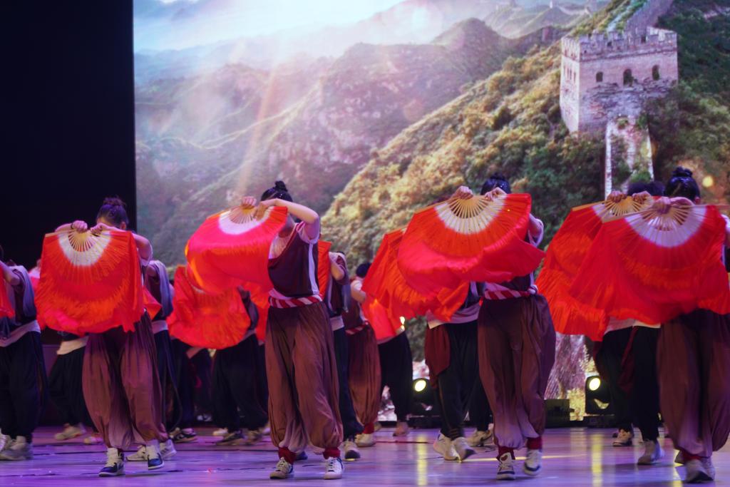 作品中,鼓声时而低沉有力,仿佛从远古传来,承载着民族的记忆,诉说着岁月的沧桑,像是历史的回响;时而又高昂激越,激荡着观众的心灵,感受着中华民族不屈不挠、勇往直前的精神力量。而扇在舞者的手中仿佛被赋予了生命,它时而如春风拂面,温柔细腻;时而如秋叶飘落,凄美哀婉;时而如战士挥剑,刚劲有力,它如诗人的笔触,勾勒出一幅幅美丽的画面,让人陶醉其中,流连忘返。鼓与扇的结合,仿佛天与地的对话,是阳刚与阴柔的和谐。学子们用他们的身体语言,将这两种元素完美地结合在一起,创造出一种独特的艺术效果。他们的舞姿,时而激昂澎湃,如同江河奔腾;时而柔美细腻,如同月光洒落。这种对比与和谐,带给观众强烈的艺术震撼,让人们在欣赏舞蹈的同时,也能感受到中华民族深厚的文化底蕴和不断创新的精神风貌。