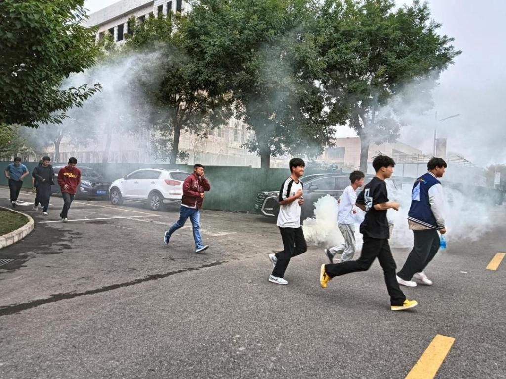 随着警报声的响起,消防演练正式开始。新生们在辅导员和班主任的指挥下,迅速捂住口鼻,弯腰低姿,按照预定的疏散路线有序地撤离到安全地带。整个疏散过程紧张而有序,充分体现了新生们良好的组织纪律性和应急反应能力。