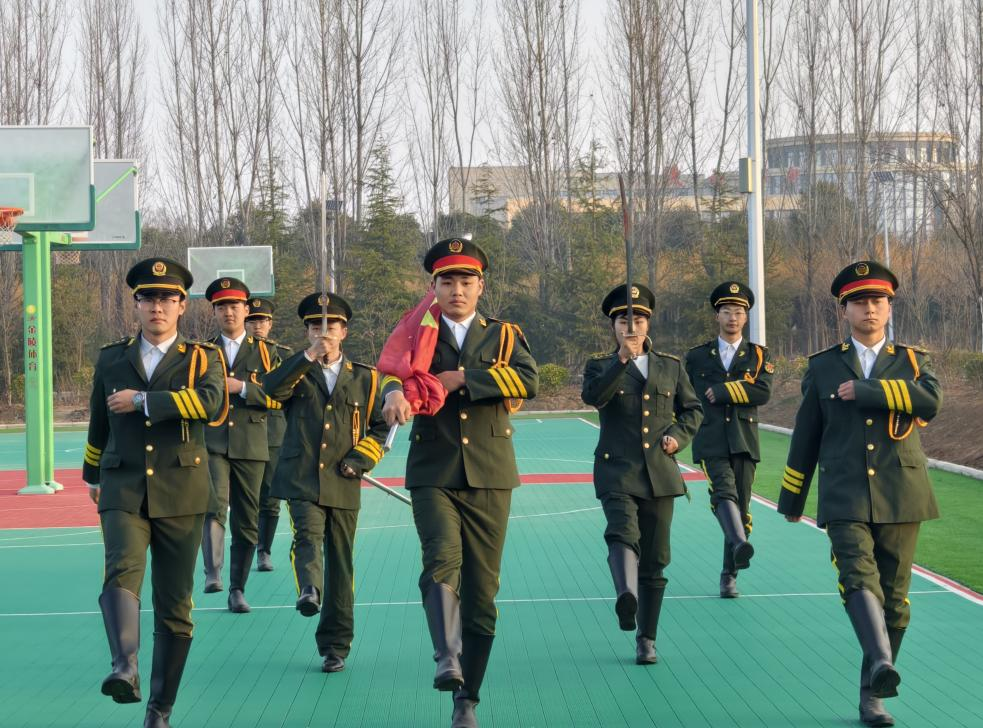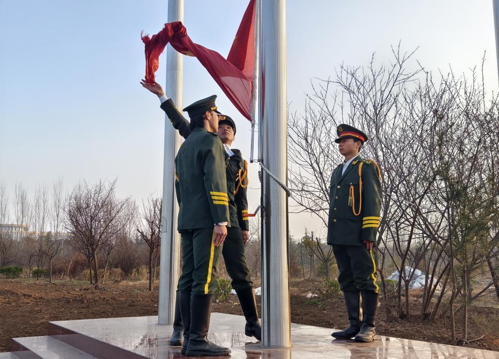 仪式首项,出旗环节,擎旗手由24铁道工程管理专业的王荣同学担任,护旗手由24机电技术1班的高宵博同学与24机电技术9班的杨立同学并肩而立,指挥手为23建筑工程2班的高毅同学与24建筑消防2班的赵甜甜同学。随着激昂雄壮的乐声回荡,五星红旗被庄重地护送至升旗现场。