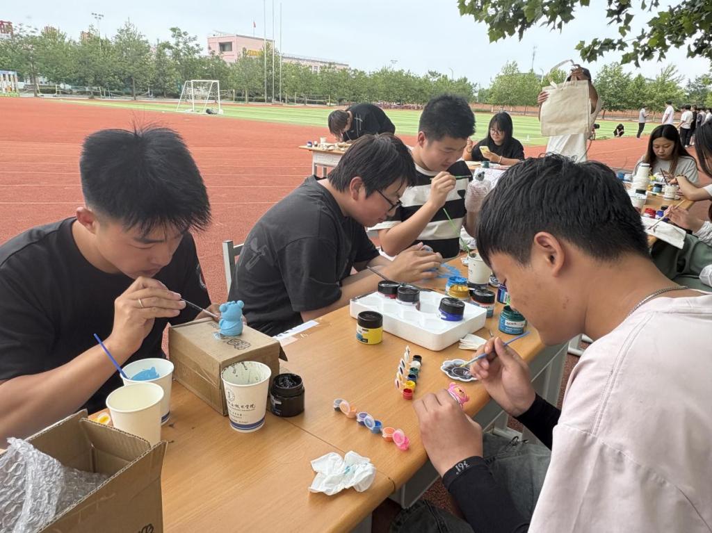 石膏娃娃涂鸦区同样热闹非凡。洁白的石膏娃娃在同学们的巧手下,变身成色彩绚丽的艺术作品。大家专注地调配颜料,细致地为娃娃上色,在涂抹的过程中,仿佛也将心中的压力与烦恼一并释放。