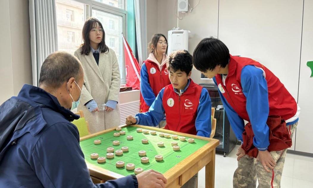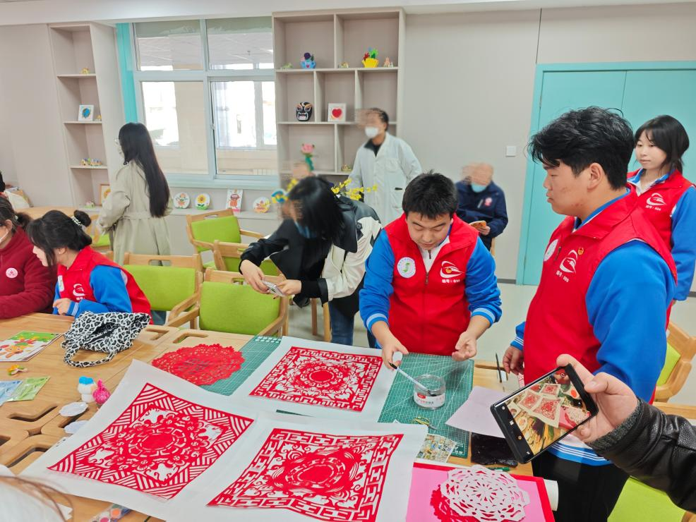 才艺表演结束后,志愿者们分组与老人们进行深入互动。剪纸组的同学与老人一起剪出精美的窗花;书法组的同学陪伴老人挥毫泼墨,感受笔墨丹青的韵味;游戏组的同学则与老人围坐一堂,进行棋牌等小游戏,现场其乐融融;情感陪伴组的志愿者们则静静地坐在老人身边,倾听他们的故事与心声,给予最温暖的情感慰藉。